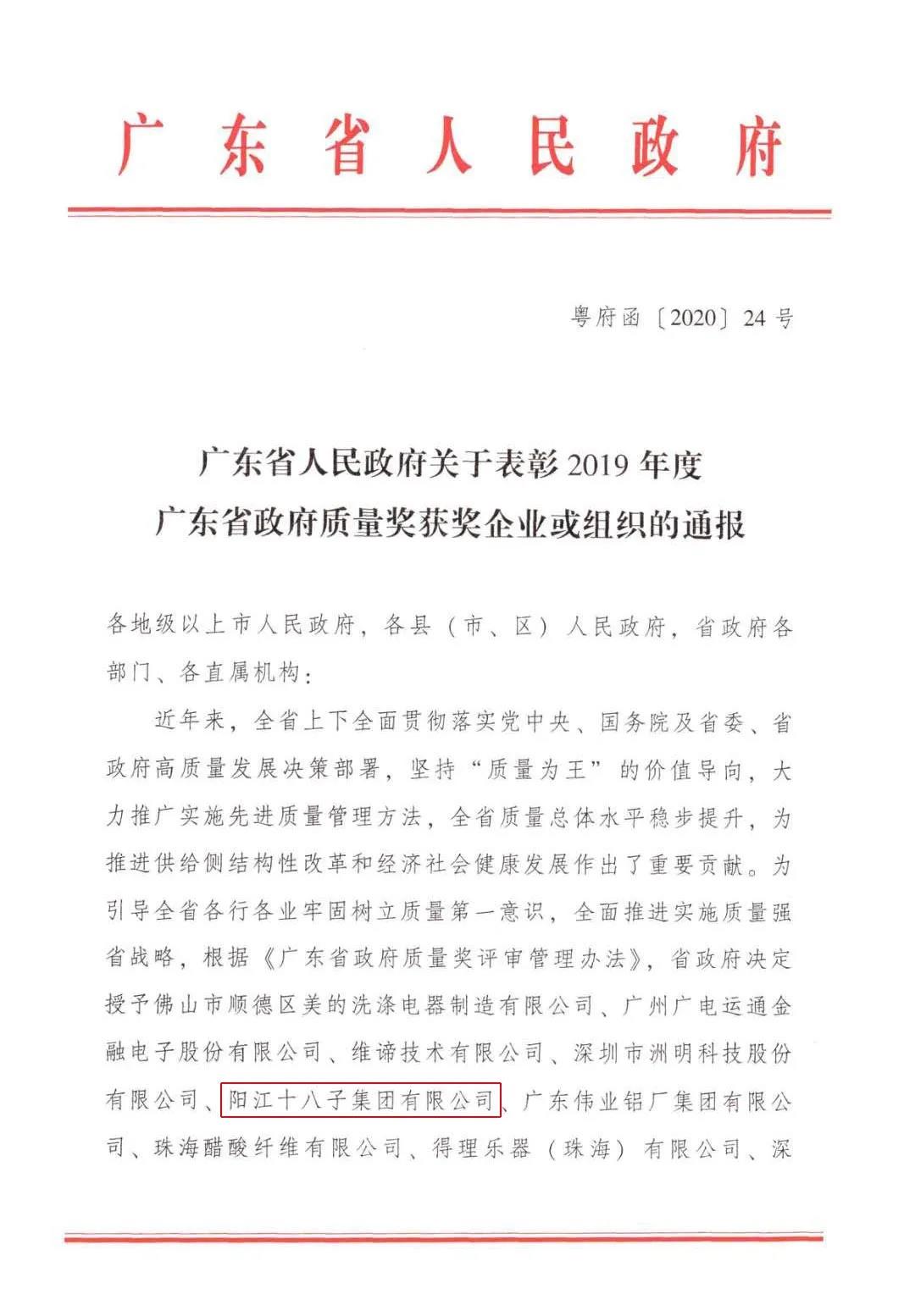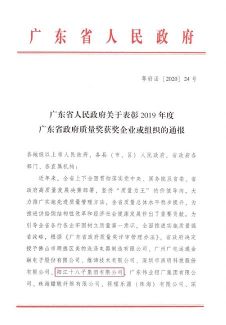 近日,廣東省人民政府發(fā)布了《關(guān)于表彰2019年度廣東省政府質(zhì)量獎獲獎企業(yè)或組織的通報》,10家企業(yè)榮獲2019年度廣東省政府質(zhì)量獎,其中,陽江十八子集團有限公司榮膺上榜,成為廣東粵西地區(qū)首家獲此殊榮的企業(yè)。
